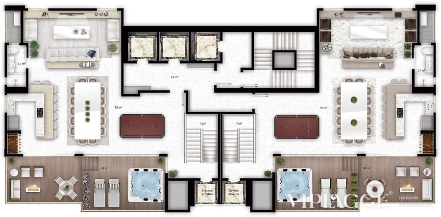 • Terraço social com spa privativo e espaço gourmet