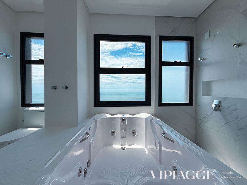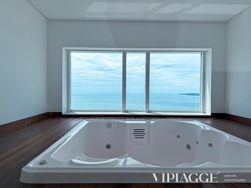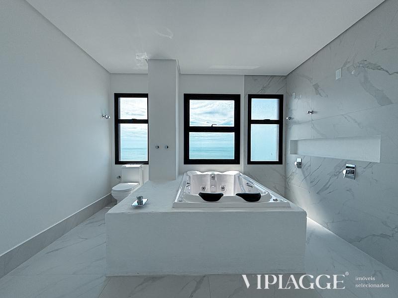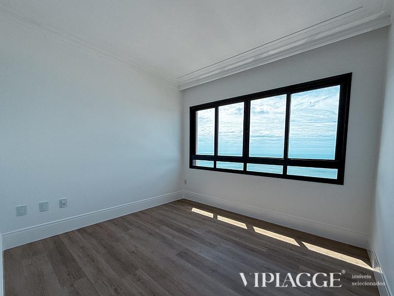Na área íntima, o apartamento dispõe de quatro suítes bem distribuídas, sendo duas suítes master voltadas para o mar. A suíte principal, com aproximadamente 43 m², conta com closet amplo e banheiro com hidromassagem panorâmica, dupla cuba e ducha dupla. As demais suítes seguem o mesmo padrão de conforto, privacidade e acabamento.